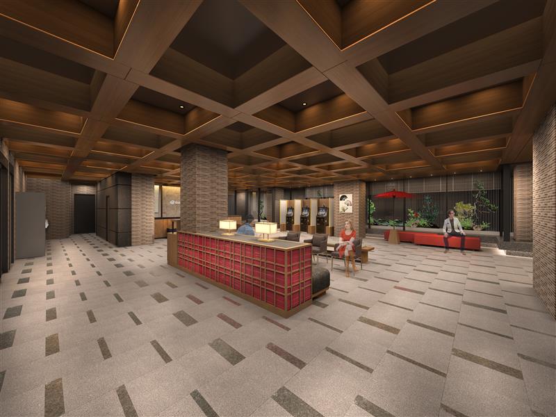 あわせて、ロビーなどの共用部も大幅にリニューアルしました。ロビーは木目や石などをベースに赤い和傘や縁台などの差し色を加え、京都らしい洗練された空間に一新しました。フロントのバックパネルには鮮やかな西陣織を重ねたタペストリーを設え、柱には京扇子を展示。各階のエレベーターホールにも玉砂利や灯籠を配置し、落ち着いた雰囲気を演出します。