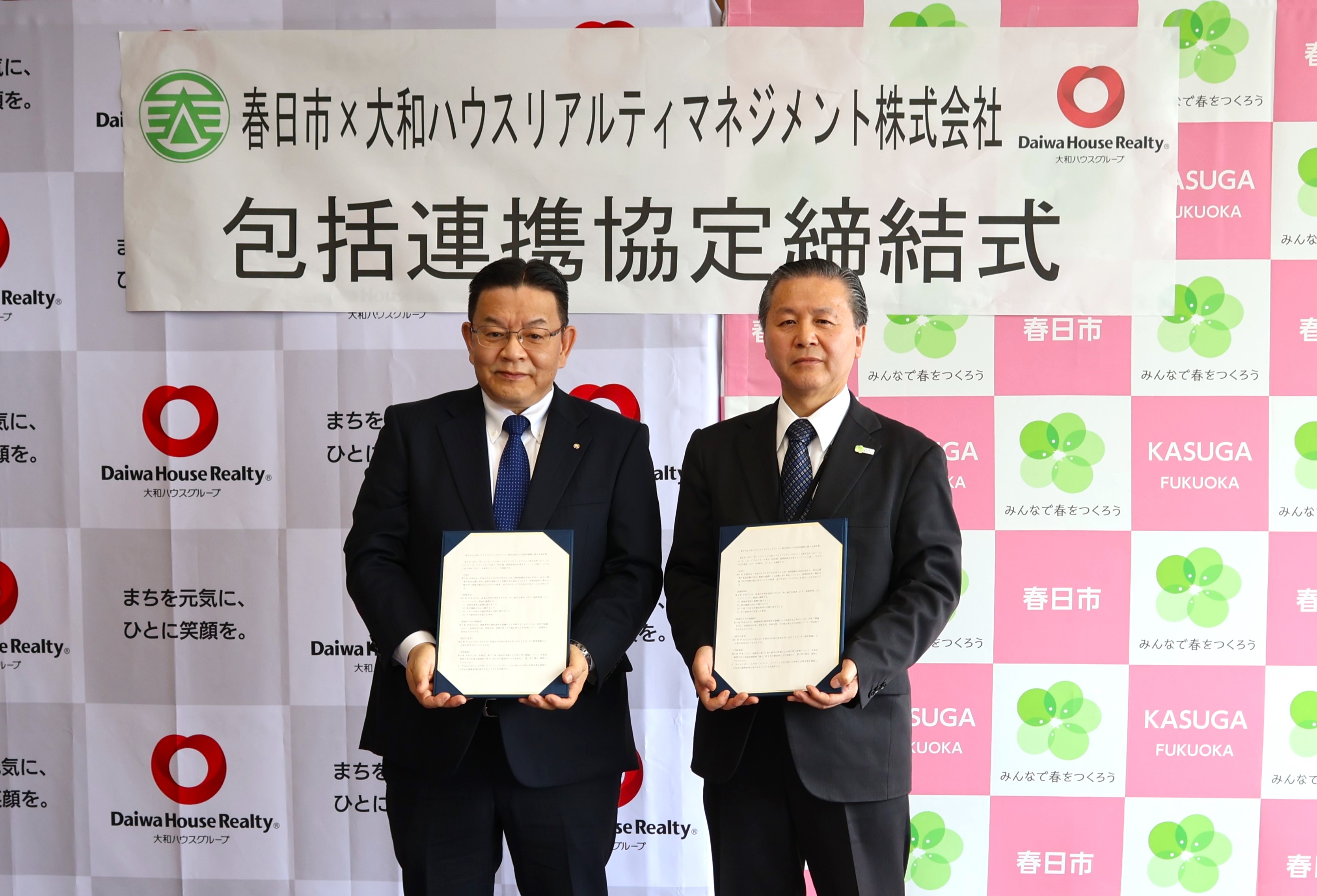 大和ハウスグループの大和ハウスリアルティマネジメント株式会社(本社:東京都千代田区、代表取締役社長:伊藤光博)は、当社が運営する「アクロスモール春日」の所在する自治体である福岡県春日市と、地域産業等の振興、子育てや青少年健全育成等の分野において連携する「包括的連携に関する協定書」を本日2026年3月19日(木)に締結し、同日に締結式を執り行いました。
