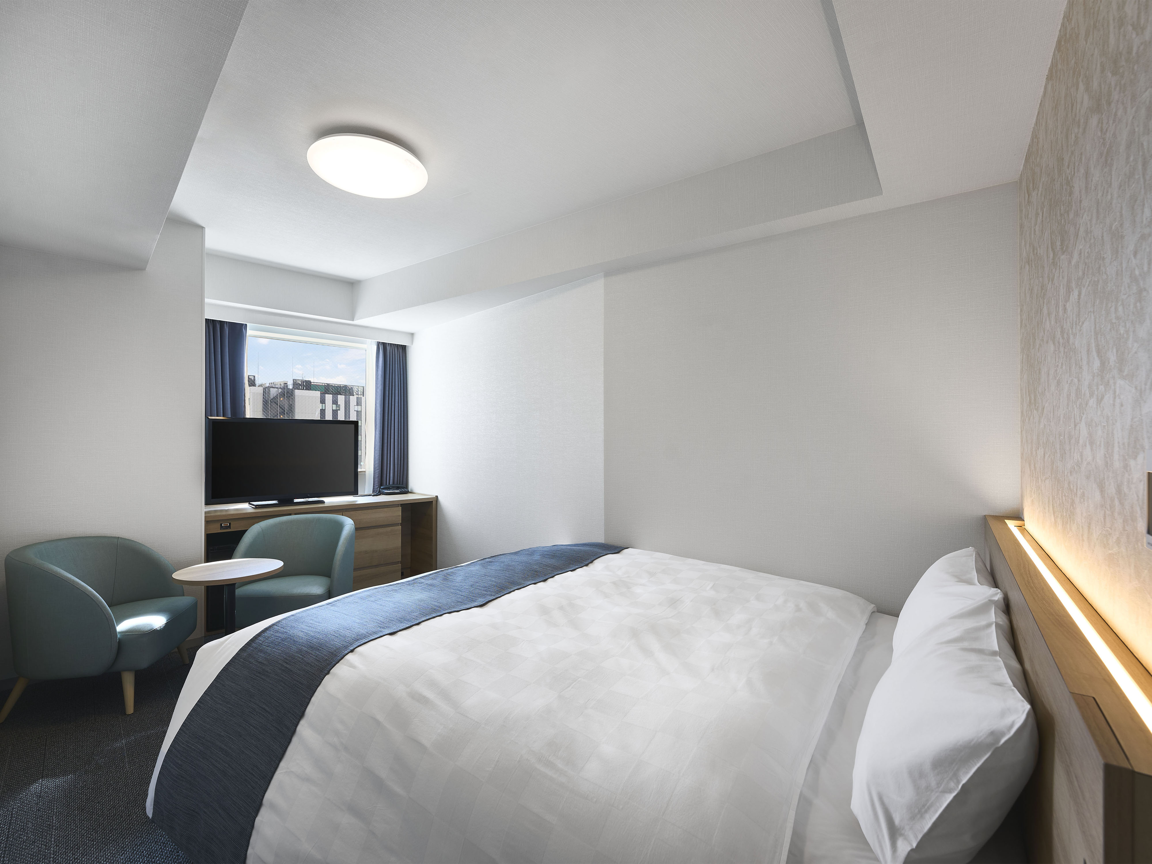 各階の角部分に位置するコンパクトなツインルームです。家具や家電などを機能的に配置することで居住性を高め、快適にお過ごしいただける空間としました。
