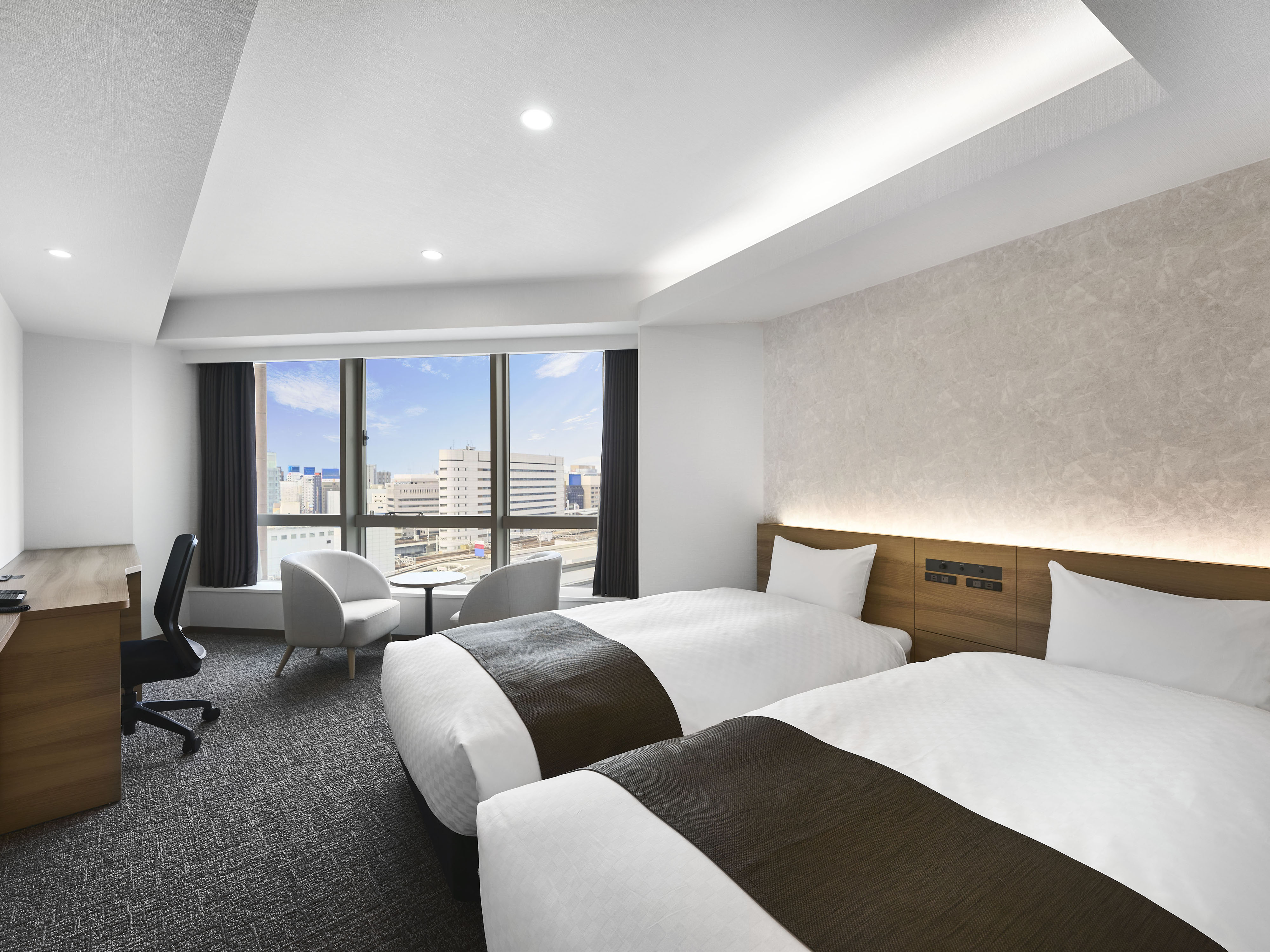 今回のリニューアルでは、ご滞在目的の多様化に対応するため、「コーナーツイン」「デラックスコーナーツイン」「スーペリアツイン」「コンフォートダブル」の4タイプの客室を新設。これまで22室だったツインタイプの客室を43室に増加させたほか、一部客室の定員を見直し全室定員2名とすることで、複数名でのご滞在に適した客室を拡充しました。そのほか全室でカーペット・壁紙の張り替えやベッド・ソファなど家具の入れ替えを行い、すっきりと明るい内装にリフレッシュ。新設の4タイプの客室にはReFaのシャワーヘッドとドライヤーも設置します。なお、「スタンダードダブル」などの客室には、これまで同様お仕事のしやすいワイドデスクを備えており、ビジネスでお越しのお客さまにも快適にご利用いただける環境を整えています。